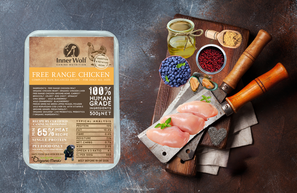 Inner Wolf free range chicken recipe has been created using whole free range chickens including bones, organic chicken organ meat